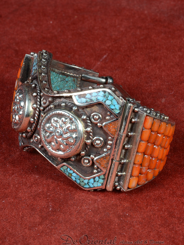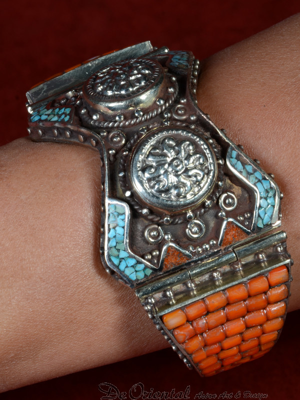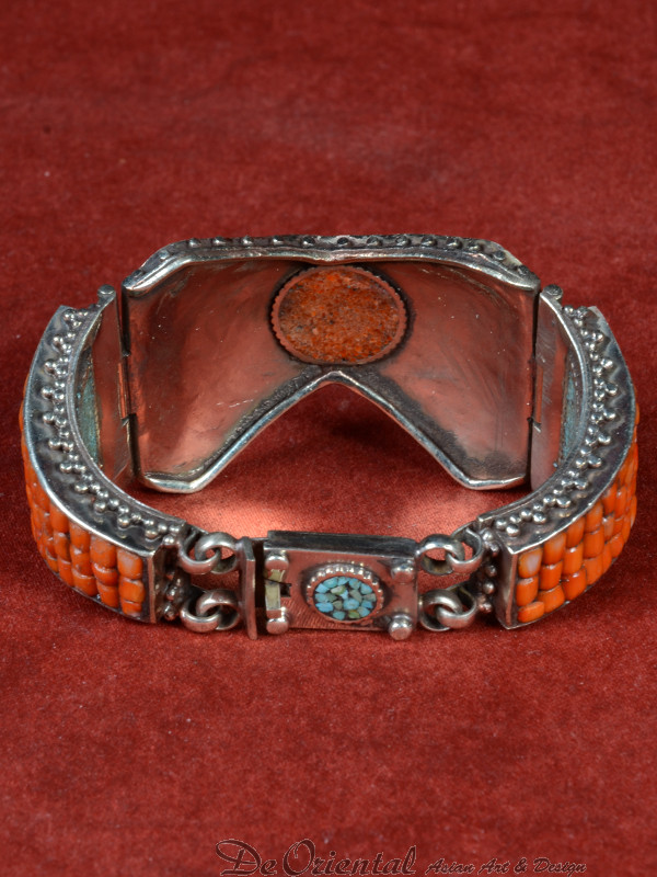 De armband is samengesteld uit o.a. turkoois en bamboe koraal, de armband is van verzilverd brons.
