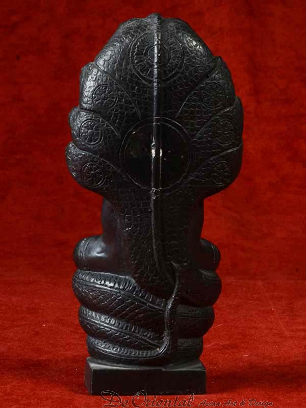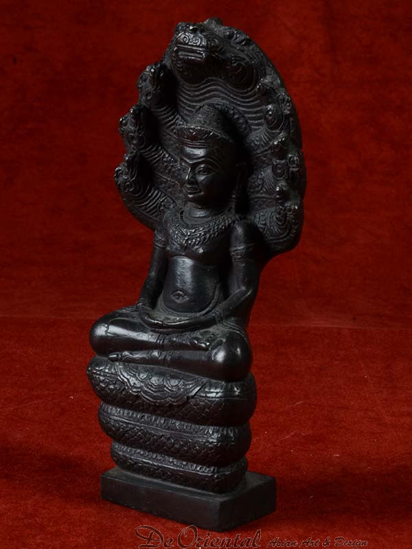 De Boeddha is gezeten op een basis welke het lichaam van de Naga voorsteld. Zijn ogen gesloten en in volledige meditatie, zijn handen in de Dhyana Mudra (pose van innerlijk evenwicht) en zijn benen in de Pamasana ofwel lotushouding.