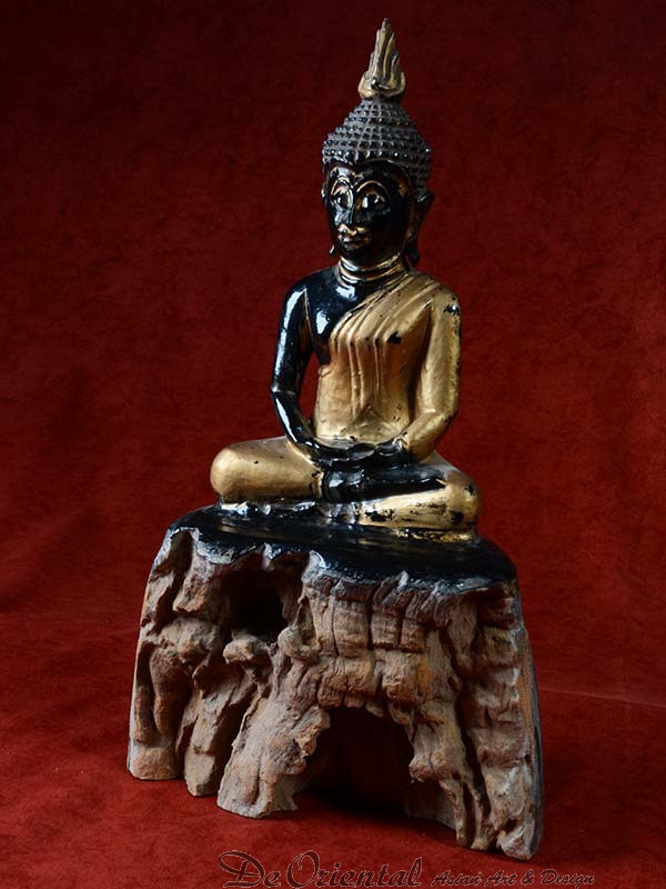 De Boeddha is gezeten op een eenvoudige basis. Zijn hand in de Dhyana Mudra (gebaar van de aarde aanraking) en zijn benen in de Pamasana ofwel lotushouding.