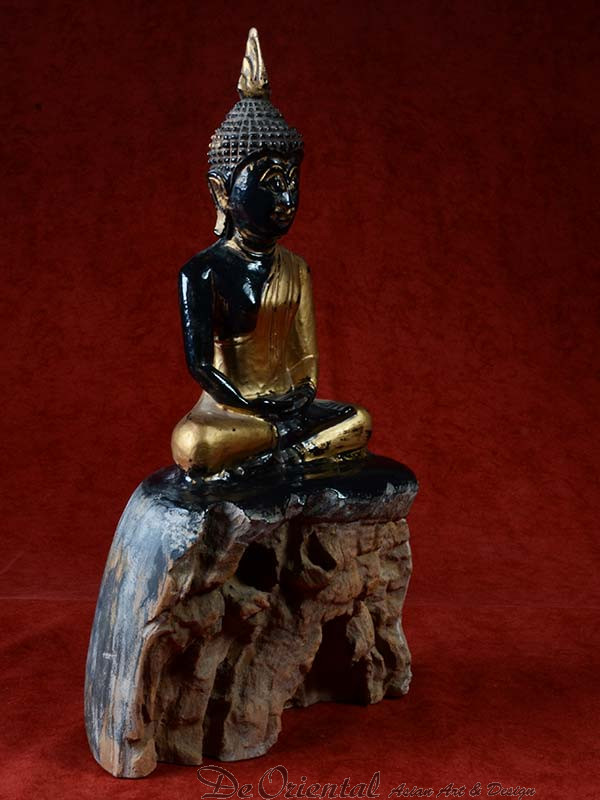 Een geheel met de hand vervaardigd houten beeld, gesneden uit een oude boomstam. Het beeld is voorzien van Thais zwart lakwerk. Het geheel is geaccentueerd met goudlak wat het beeld zeer decoratief maakt.