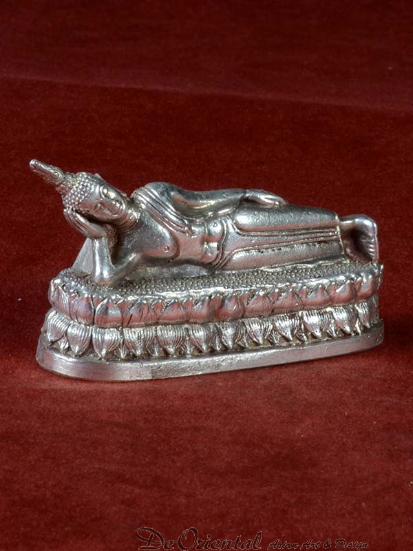 De Boeddha is hier in liggende positie afgebeeld, zijn rechtse arm dient als kussen en zijn linkse arm ligt op zijn linker zijde.