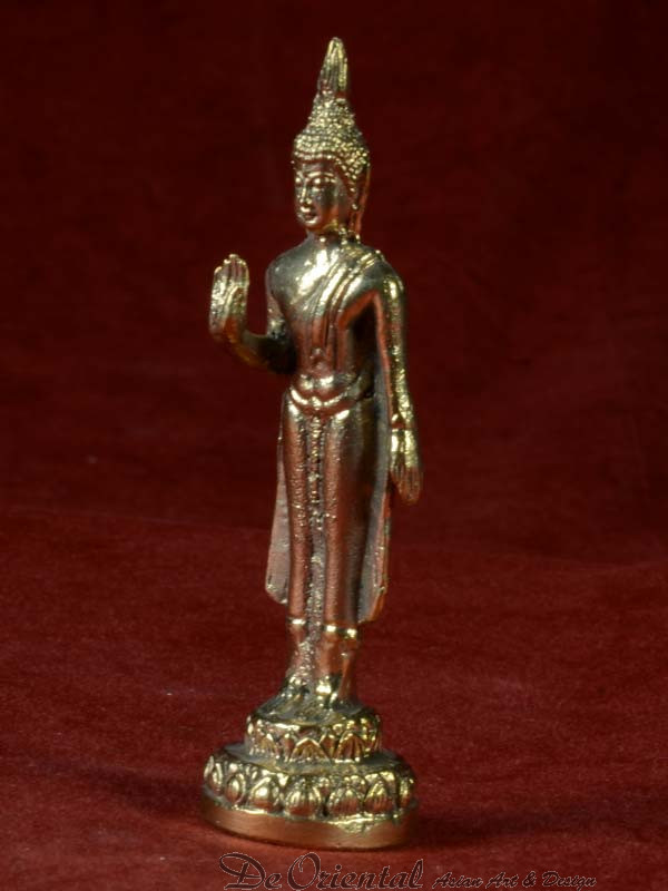 De Boeddha staat rechtop zijn rechtse arm uitgestoken met de handpalm naar voren als geste voor afwering van het kwaad. Soms ook afgebeeld met twee handen naar voren gericht.