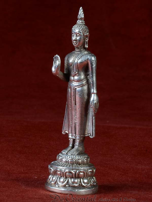De Boeddha staat rechtop zijn rechtse arm uitgestoken met de handpalm naar voren als geste voor afwering van het kwaad. Soms ook afgebeeld met twee handen naar voren gericht.