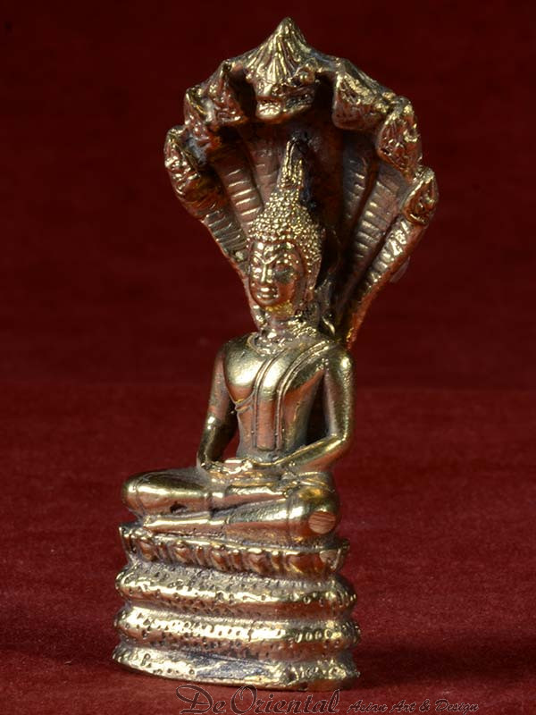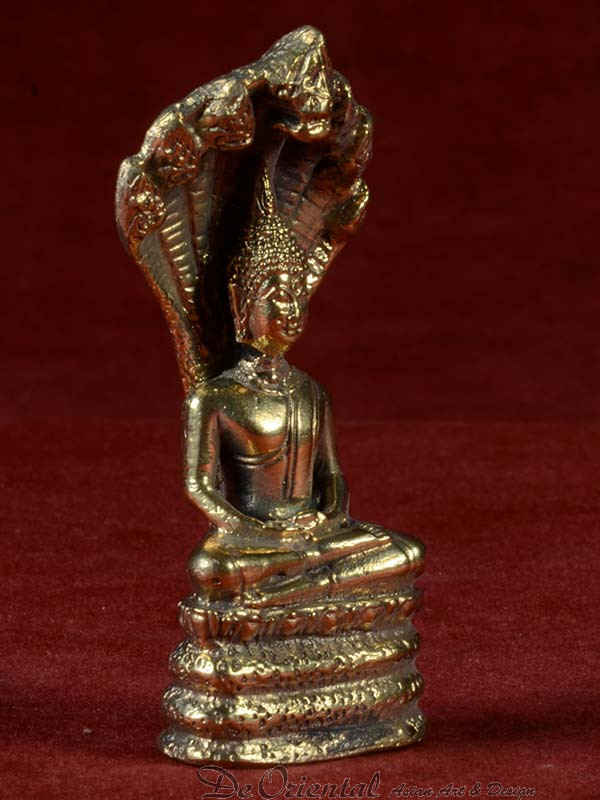 Een uit Thailand afkomstig messing miniatuur beeldje van de zaterdag Boeddha, De Boeddha is hier in meditatie en de Naga Mucalinda beschermd hem.