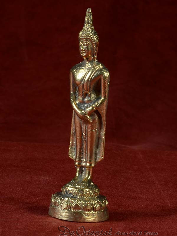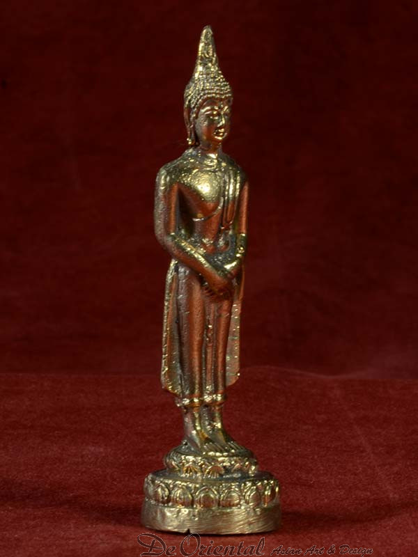 Een uit Thailand afkomstig messing miniatuur beeldje van de zondag Boeddha.