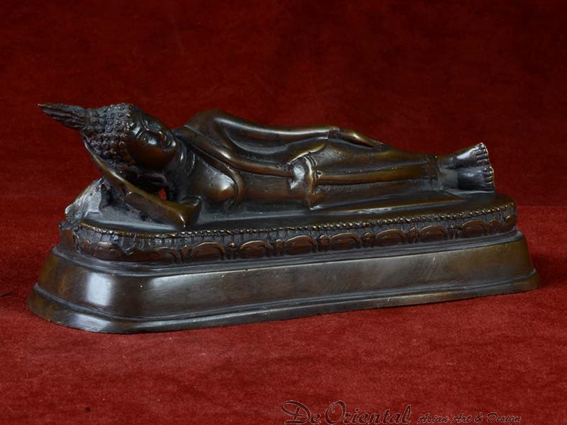 De Boeddha is hier in liggende positie afgebeeld, zijn rechtse arm dient als kussen en zijn linkse arm ligt op zijn linker zijde.