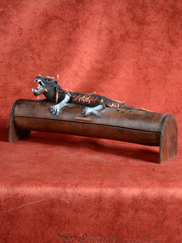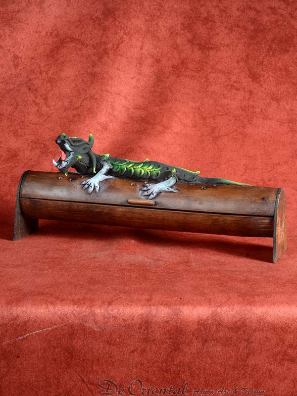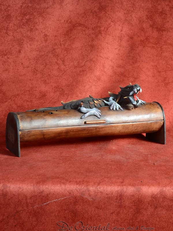 Het doosje is vervaardigd van bamboe, de draak is gemaakt van een geknede houtmix en met de hand geschilderd.
