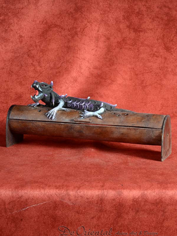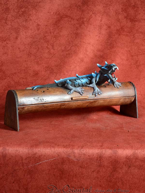 Een met de hand vervaardigde wierookbrander met een draak. De leuke decoratieve draak is op de deksel van de brander bevestigd. U kunt heel eenvoudig een wierookstokje plaatsen en daarna de deksel dicht doen. De rook kringelt dan uit de gaatjes welke onder de draak zitten. Nooit geen as meer op tafel.
