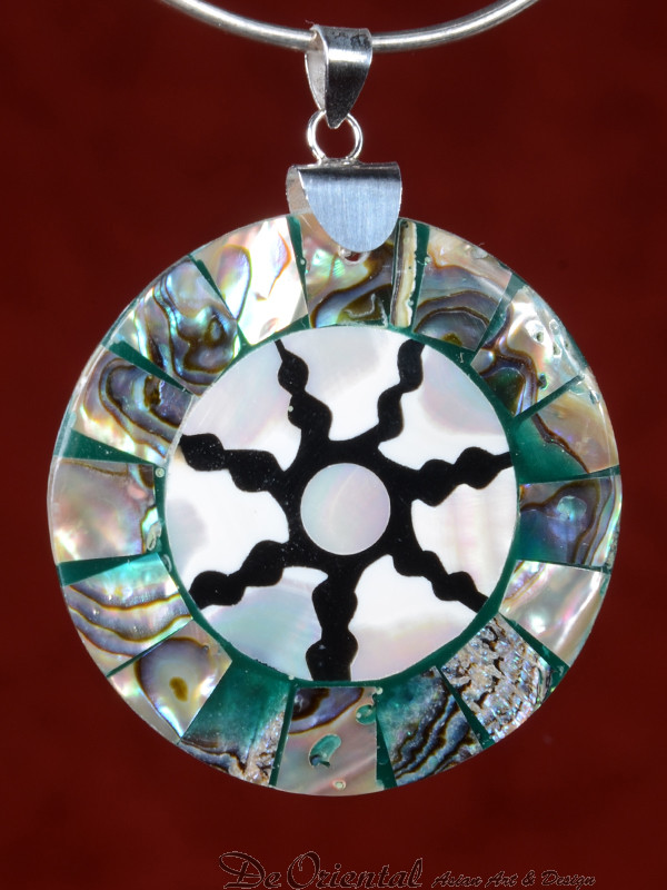 In het midden is een schelp met het oog van Shiva geplaatst, de stralenkrans beeld de zon uit.