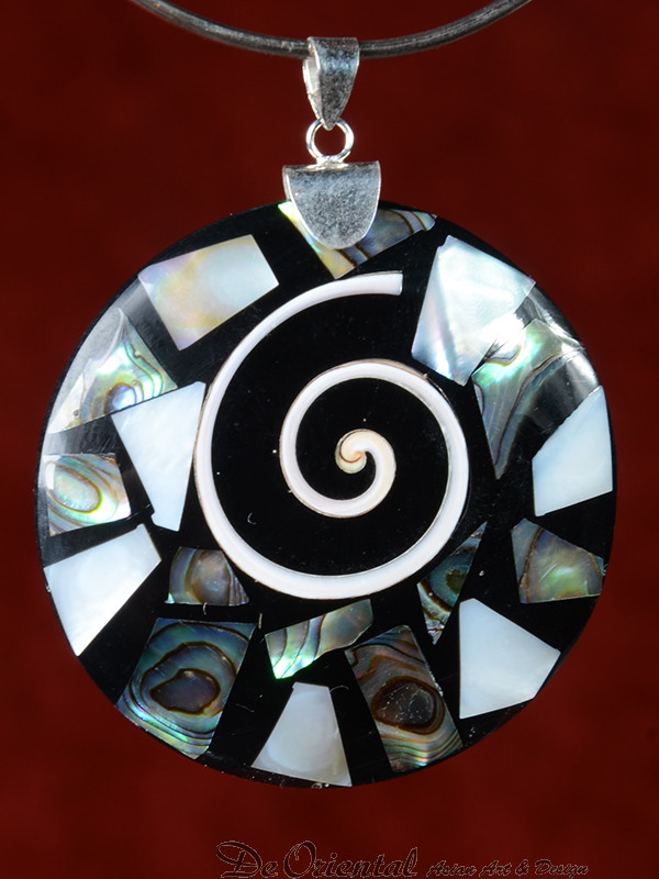 Een op zeer creatieve wijze vervaardigd sieraad van een samenstelling van stukjes parelmoer en koraal, gegoten in een kunsthars.