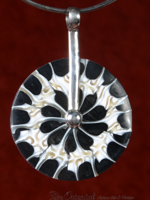 Een op zeer creatieve wijze vervaardigd sieraad van een samenstelling van stukjes schelp, gevat in zilver.