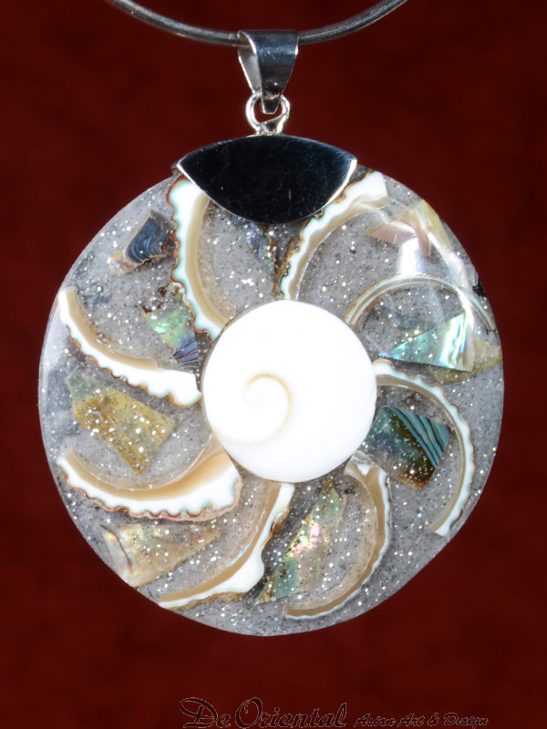 Een op zeer creatieve wijze vervaardigd sieraad van een samenstelling van stukjes schelp en parelmoer, gegoten in een kunsthars.