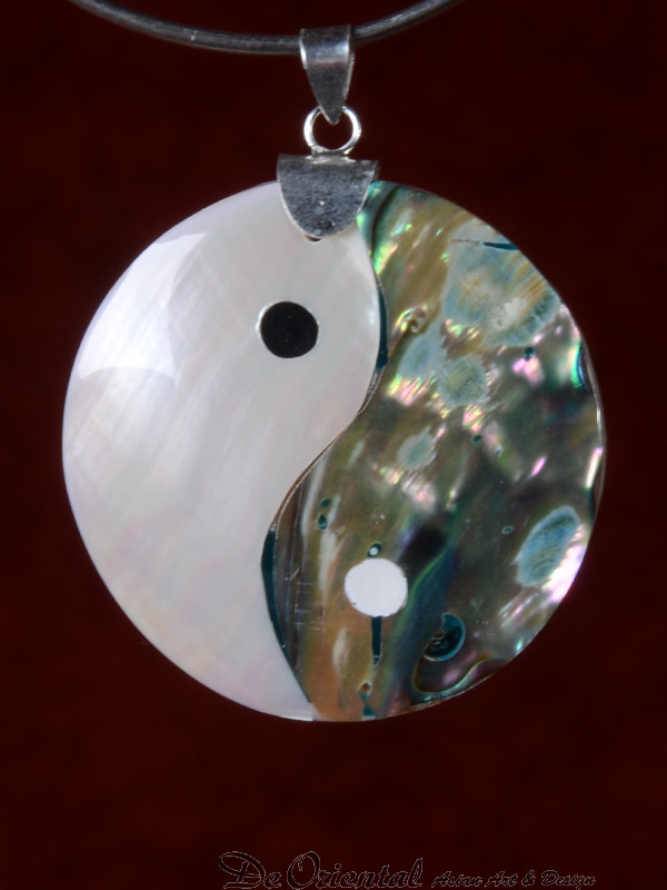 Een op zeer creatieve wijze vervaardigd sieraad van YinYang gemaakt van een samenstelling van schelp en parelmoer.