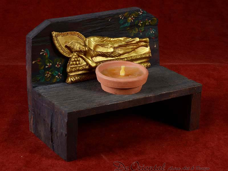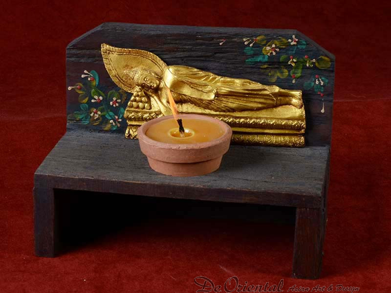 De Boeddha is hier in liggende positie afgebeeld, zijn rechtse arm dient als kussen en zijn linkse arm ligt op zijn linker zijde.