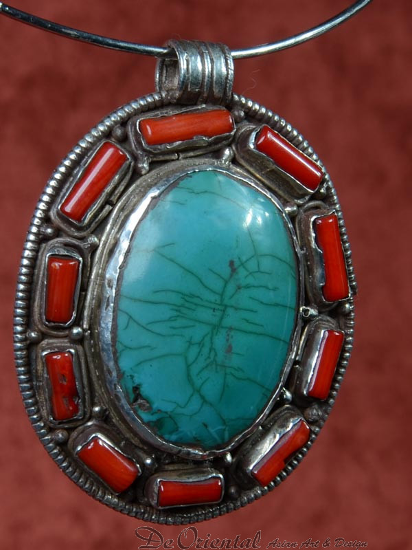 Aan de voorzijde is de zilveren hanger bezet met turkoois en bamboekoraal.