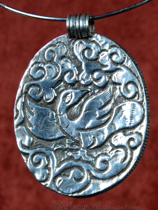 De achterzijde is rijkelijk bewerkt met een afbeelding van een vogel.