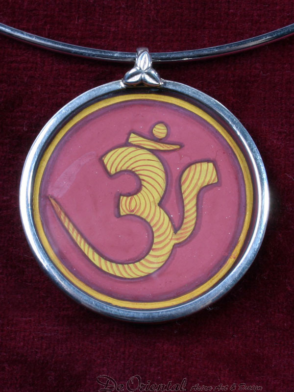 Miniatuur tekening van het "Om" symbool. Gevat in een zilveren houder afgedekt door een glazen ruitje.