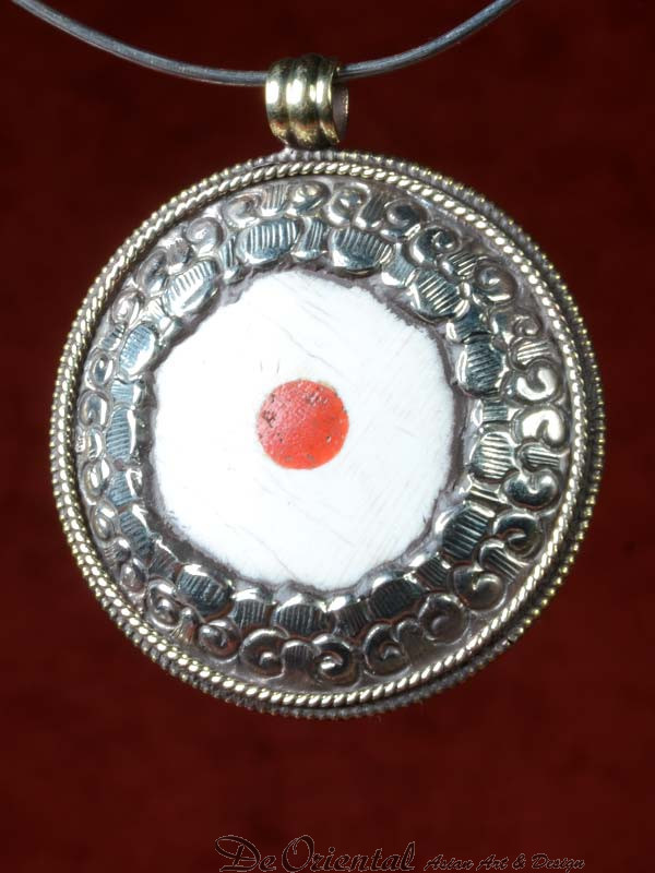 Een van been vervaardigde hanger met het derde oog symbool van Shiva