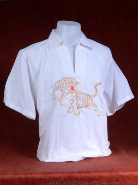 Linnen tropenshirt met geborduurde tijger wit-goud