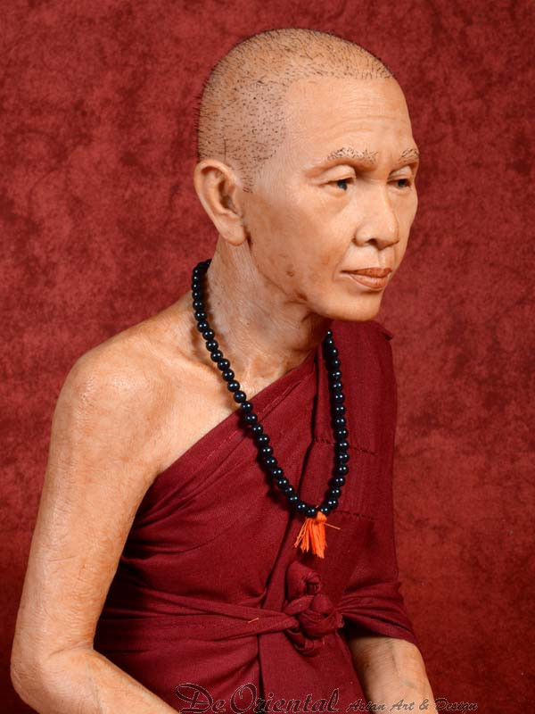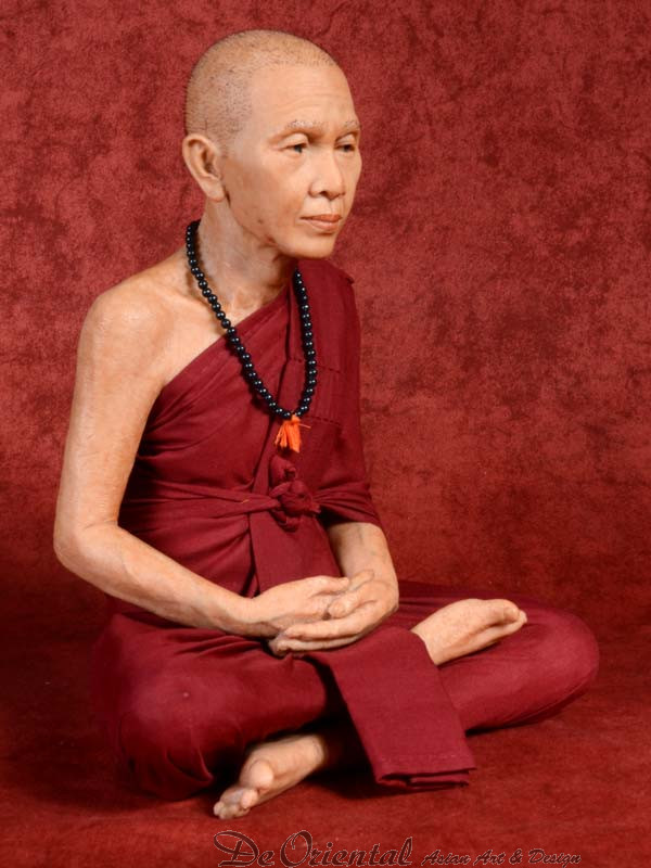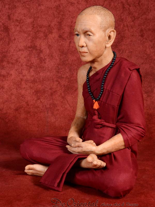 Geheel met de hand vervaardigde Thais Boeddhistische monnik. De monnik is geheel in de originele stijl vervaardigd naar beeltenis van de inmiddels overleden monnik. De kleding is in originele kleurstelling en dracht zoals deze in het klooster van deze monnik werd en nog steeds wordt gedragen.
