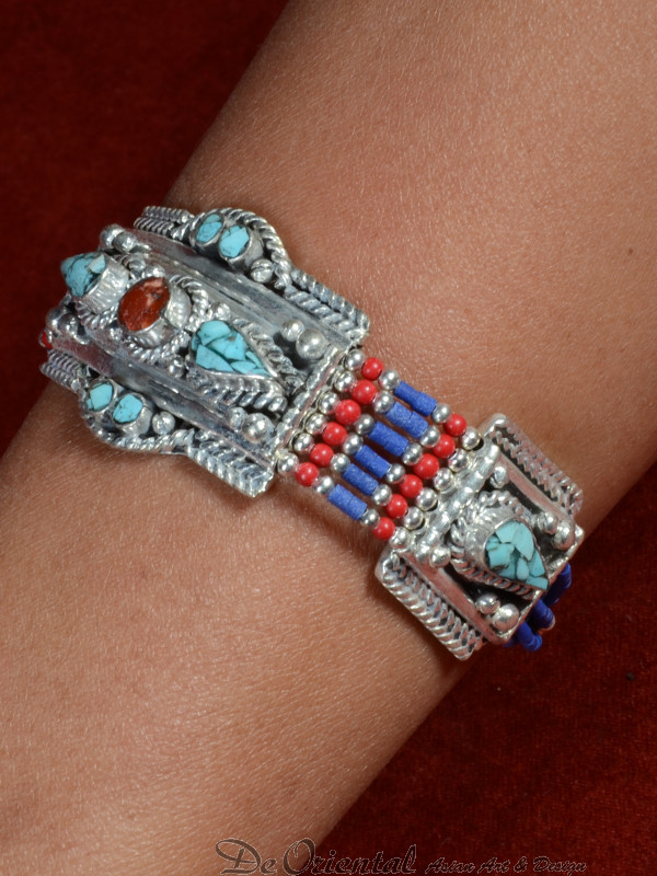 De armband is samengesteld uit o.a. turkoois, lapis lazuli en bamboe koraal, de armband is van verzilverd witmetaal.
