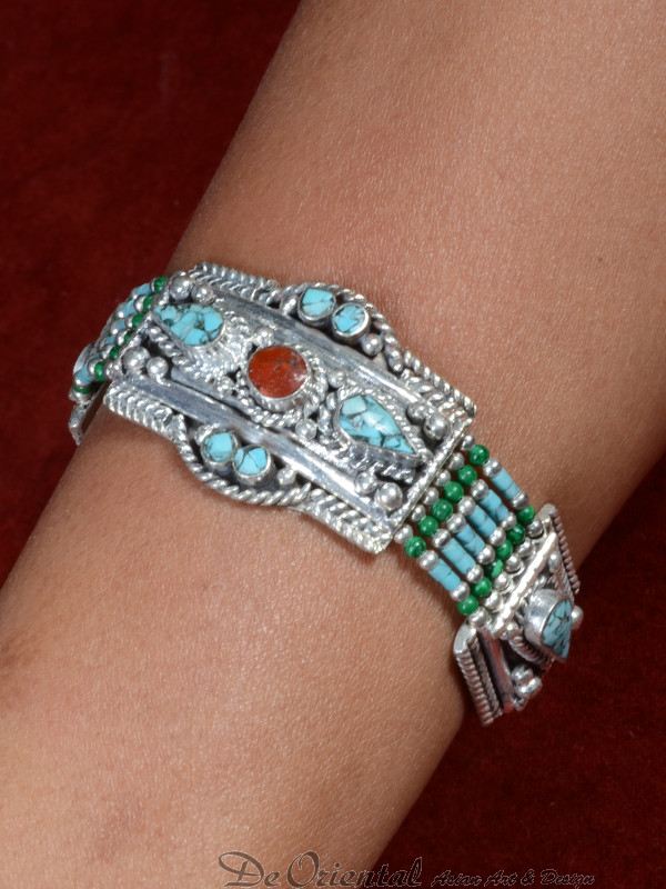 De armband is samengesteld uit o.a. turkoois, malachiet en bamboe koraal, de armband is van verzilverd witmetaal.