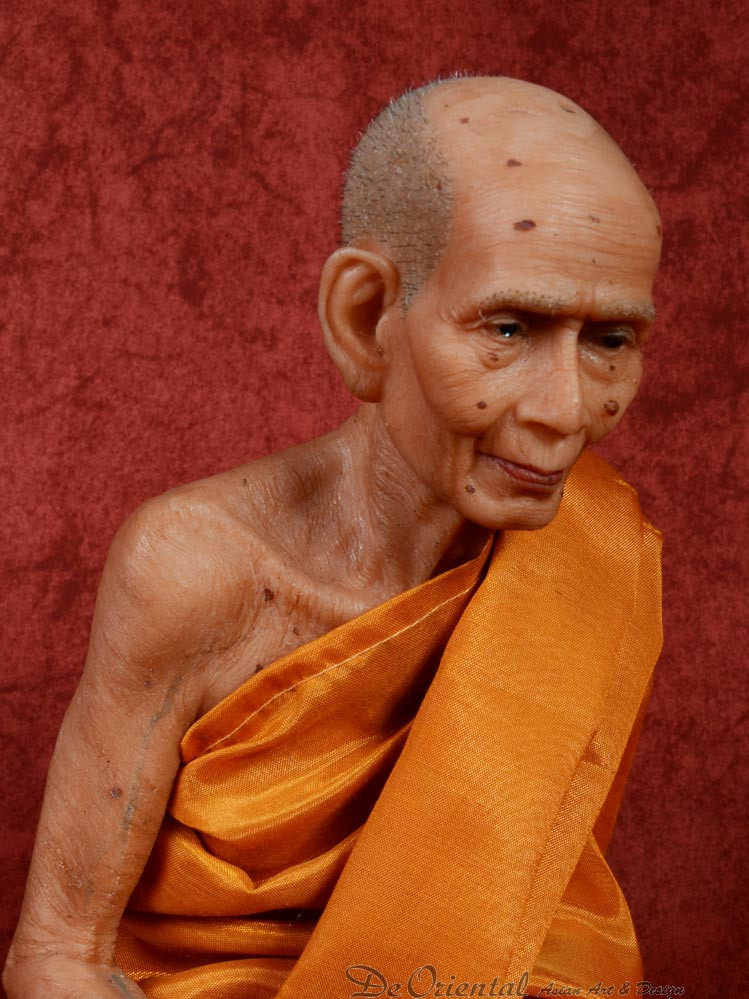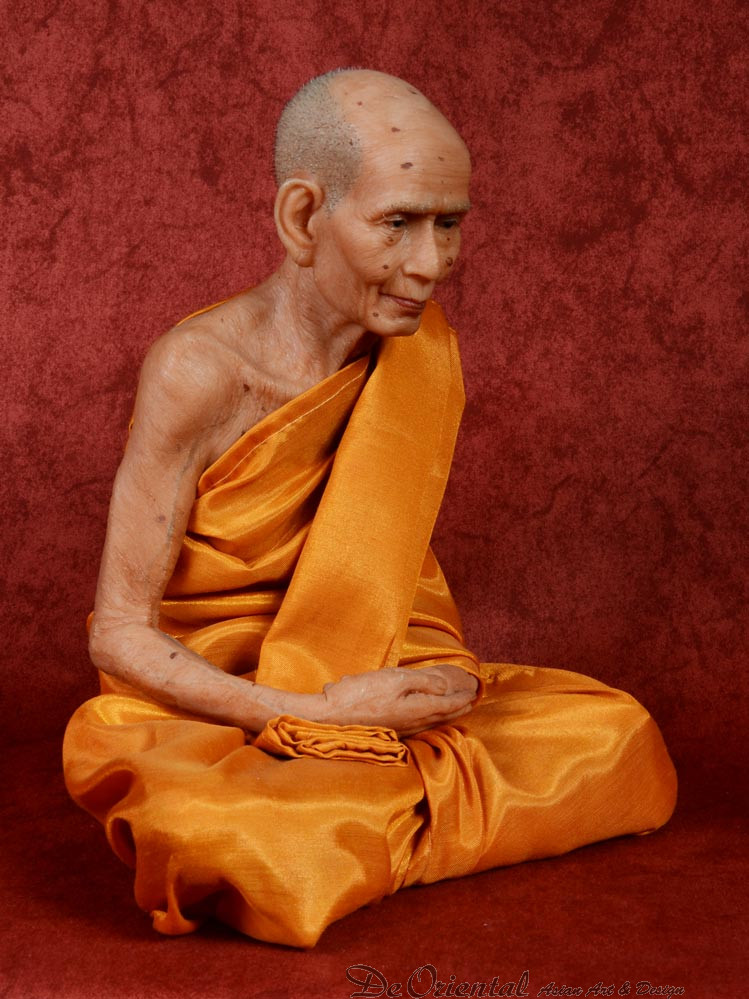 Geheel met de hand vervaardigde Thais Boeddhistische monnik. De monnik is geheel in de originele stijl vervaardigd naar beeltenis van de inmiddels overleden monnik. De kleding is in originele kleurstelling en dracht zoals deze in het klooster van deze monnik werd en nog steeds wordt gedragen.