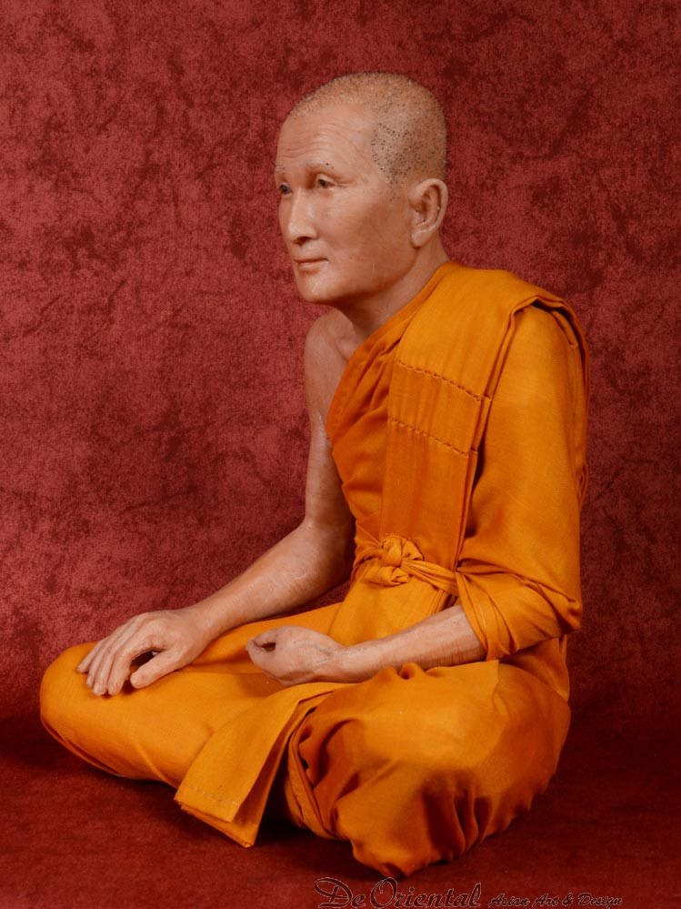 Geheel met de hand vervaardigde Thais Boeddhistische monnik. De monnik is geheel in de originele stijl vervaardigd naar beeltenis van de inmiddels overleden monnik. De kleding is in originele kleurstelling en dracht zoals deze in het klooster van deze monnik werd en nog steeds wordt gedragen.