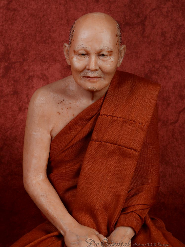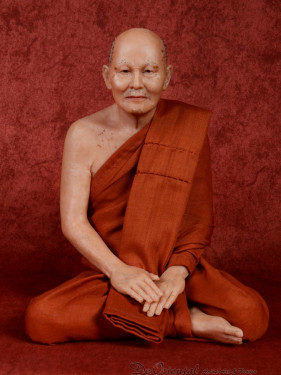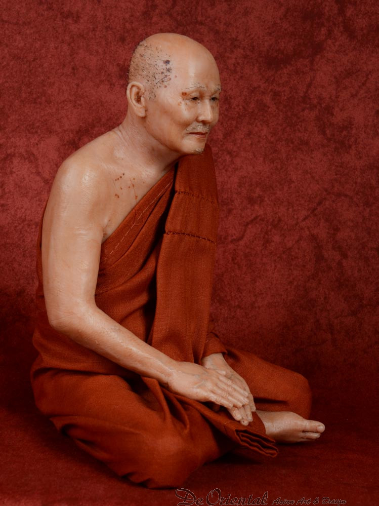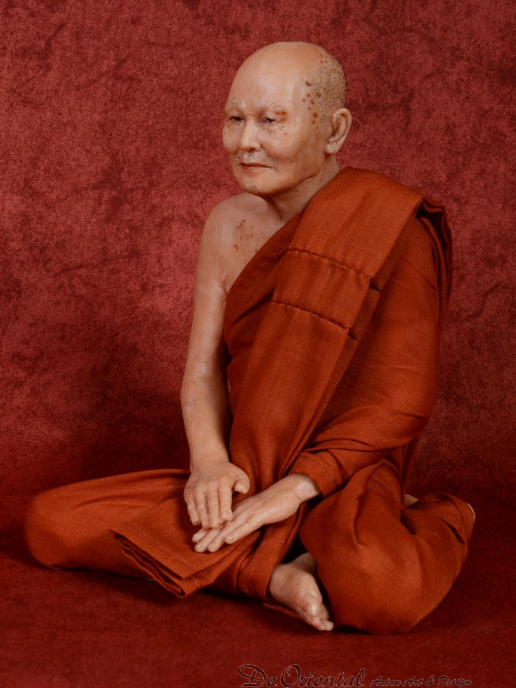 Geheel met de hand vervaardigde Thais Boeddhistische monnik. De monnik is geheel in de originele stijl vervaardigd naar beeltenis van de inmiddels overleden monnik. De kleding is in originele kleurstelling en dracht zoals deze in het klooster van deze monnik werd en nog steeds wordt gedragen.