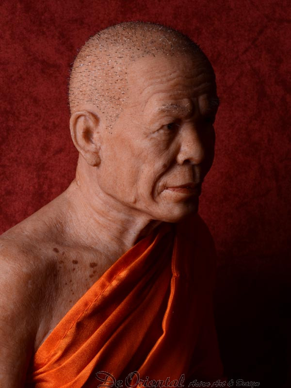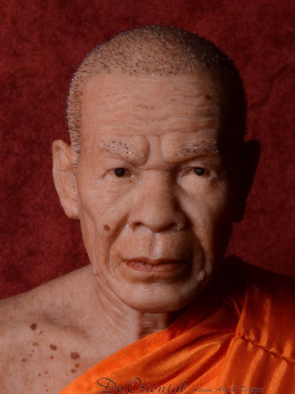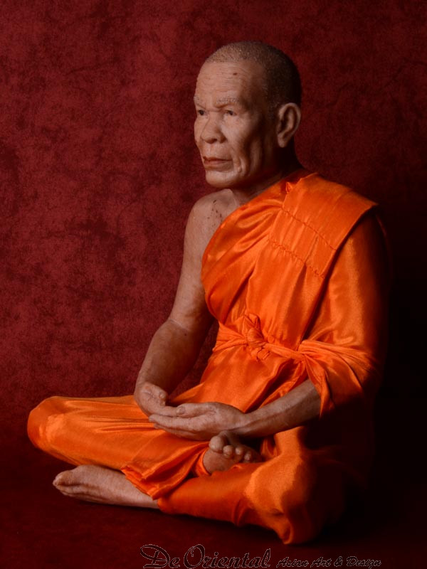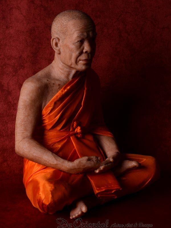 Geheel met de hand vervaardigde Thais Boeddhistische monnik. De monnik is geheel in de originele stijl vervaardigd naar beeltenis van de inmiddels overleden monnik. De kleding is in originele kleurstelling en dracht zoals deze in het klooster van deze monnik werd en nog steeds wordt gedragen.