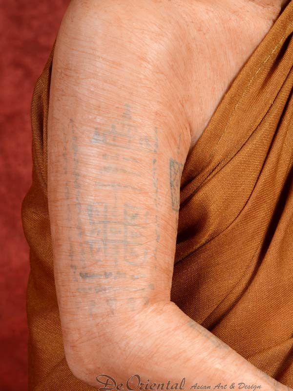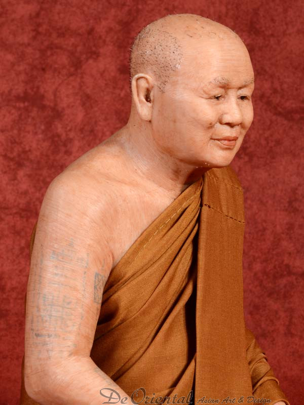 Geheel met de hand vervaardigde Thais Boeddhistische monnik. De monnik is geheel in de originele stijl vervaardigd naar beeltenis van de inmiddels overleden monnik. De kleding is in originele kleurstelling en dracht zoals deze in het klooster van deze monnik werd en nog steeds wordt gedragen.