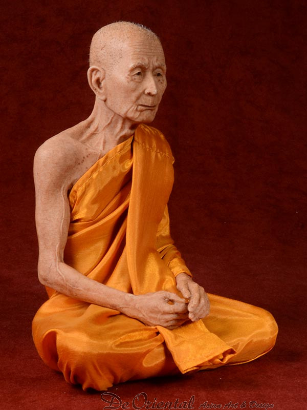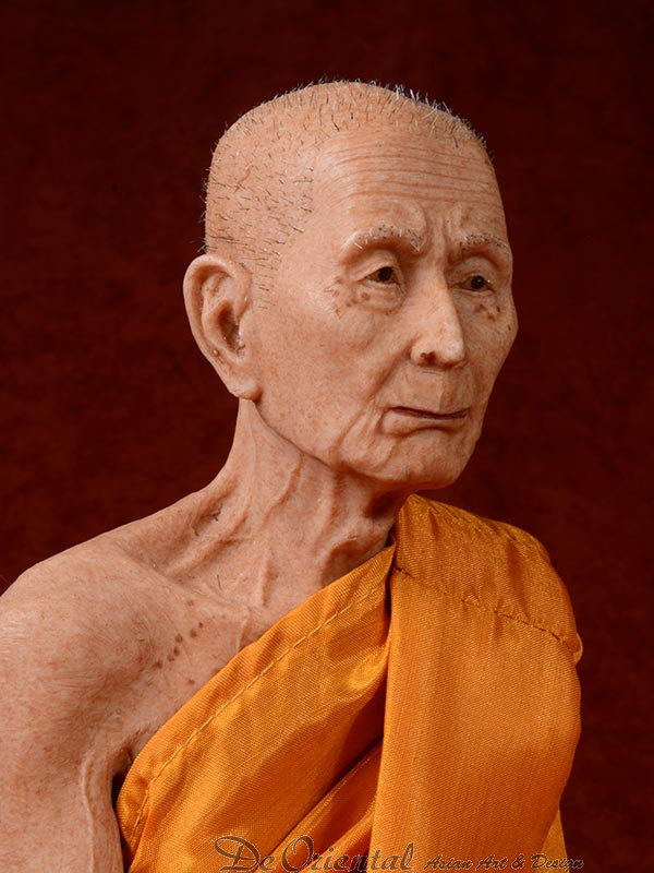 Geheel met de hand vervaardigde Thais Boeddhistische monnik. De monnik is geheel in de originele stijl vervaardigd naar beeltenis van de inmiddels overleden monnik. De kleding is in originele kleurstelling en dracht zoals deze in het klooster van deze monnik werd en nog steeds wordt gedragen.