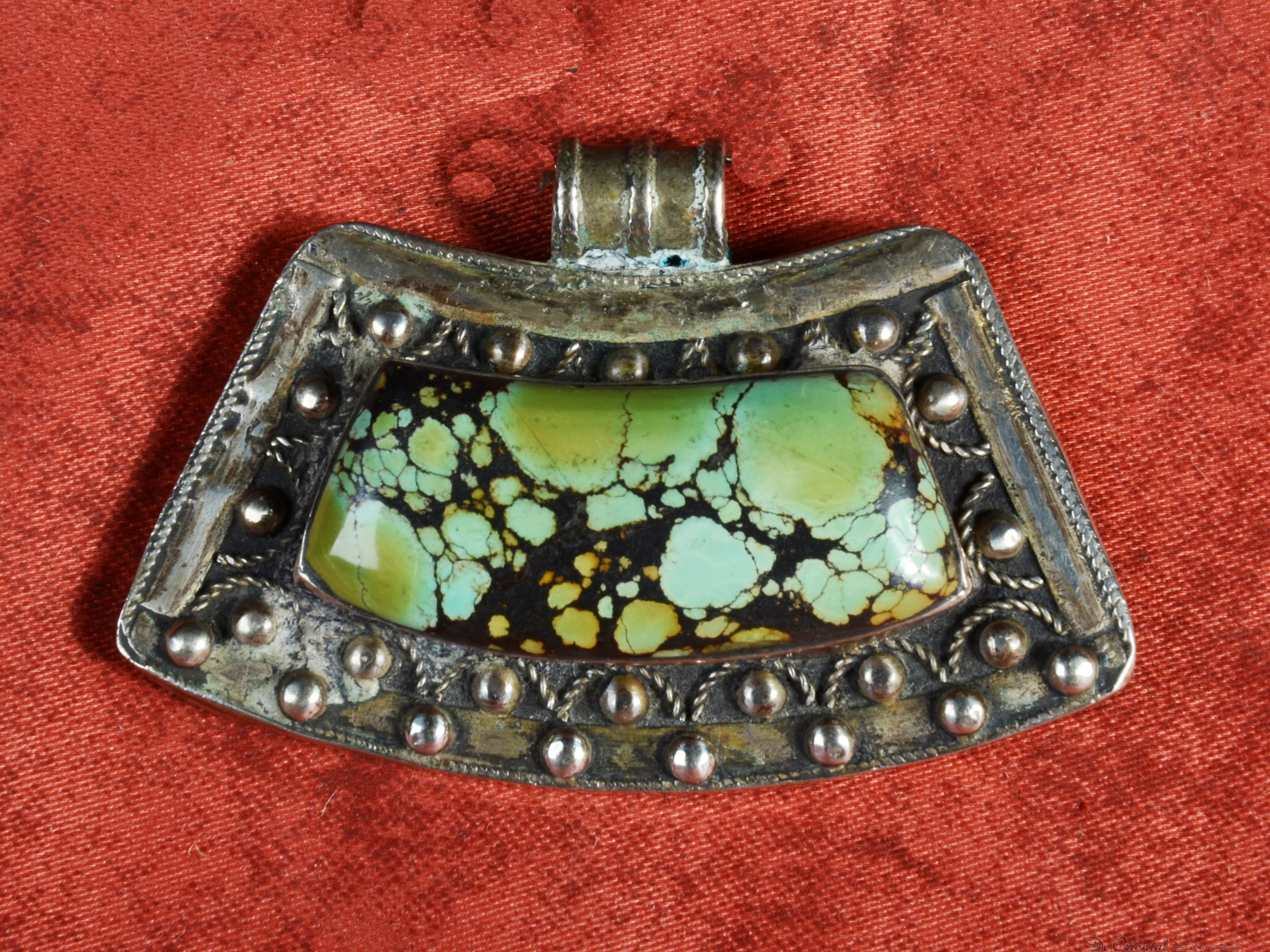 Deze vintage zilveren hanger ademt authenticiteit en vakmanschap. Het opvallende ontwerp combineert een grote cabochon van groene turquoise met een organisch netwerk van donkere matrixlijnen, geplaatst in een robuuste zilveren setting. De rand van de hanger is versierd met gehamerde boldecoraties en subtiele gravures die het stuk een etnische en tijdloze uitstraling geven.
