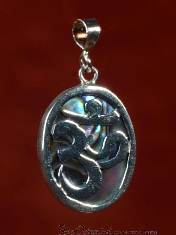 Zilveren hanger met Om teken, ingelegd met parelmoerZilveren hanger met Om teken, ingelegd met parelmoer